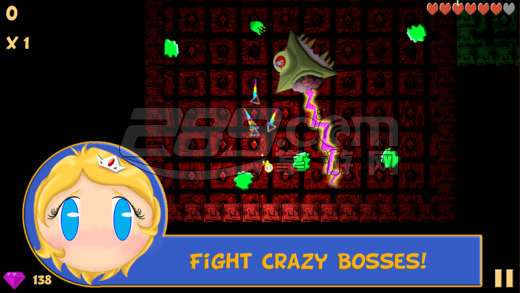 游戏中,玩家扮演的蓝色小精灵看似可爱,不过可不是任人欺负的,除了拖动屏幕就可以左右挪移之外,点击屏幕还可发射弹药,十分凶猛。可是地牢中也有形态各异的怪物和陷阱,而且在最后的房间还必须直面强力恐怖的 BOSS,在生命耗尽之前通过尽量多的关卡,得到的积分和排名都会越高。