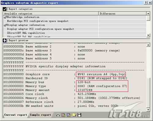在“Graphics core”一样,我们可以清楚地看到该卡是采用A4版本的NV43图形核心,4pp和3vp分别是代表该核心具备4条渲染管线和3个顶点单元。“Memory bus”和“Memory type”分别显示显存的带宽和类型,如果你不知道显卡的显卡是128位还是256位,显存是DDR1、DDR2还是DDR3,甚至是DDR4,检查这两个测验结果就会一清两楚。至于“Memory amount”就是显存容量,131072KB换算为MB的话,就是128MB。图中看出,该卡是自带了128M 128位 DDR3显存。