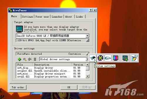 为了更加直观地了解显卡的核心频率和显存频率,以及尝试对它们进行超频,这里单独对它们进行检测。这里必须讲清楚,显卡超频不同于CPU,超频幅度太大很容易对显卡造成永久性的物理伤害,通常是烧掉核心或者是显存,因此大家在这个问题上面的处理一定要慎重。同样是使用“RivaTuner”,如图所示,在“Driver settings”那里选择第一项“System settings”,然后就可以进入相关的操作界面。